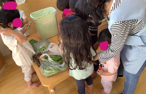 『むきむきしたおまめ~』と言いながら喜んでそら豆を楽しむ子ども達。