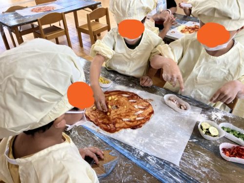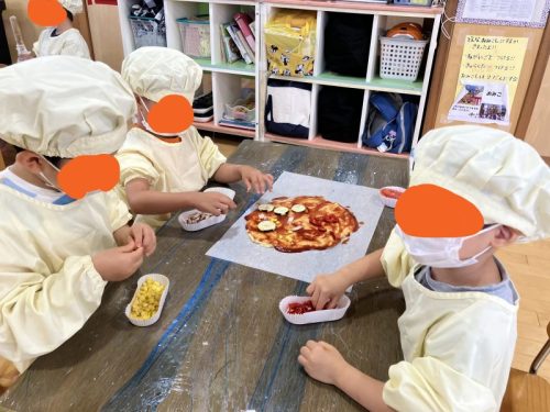 どんなピザ作るかは、一緒に作るグループのお友達と考えてもらい、協力し合って作りました。