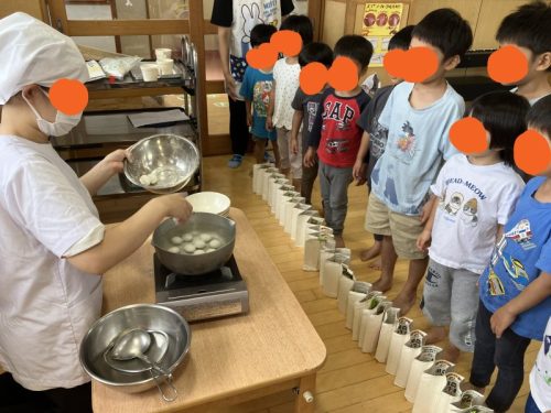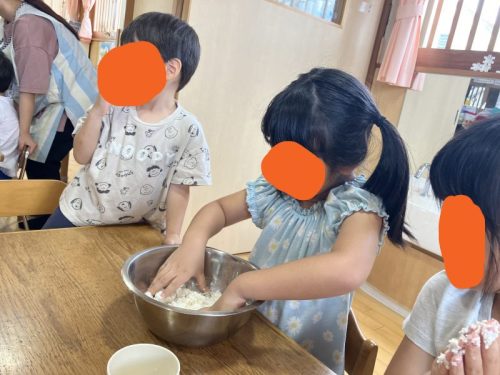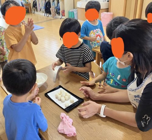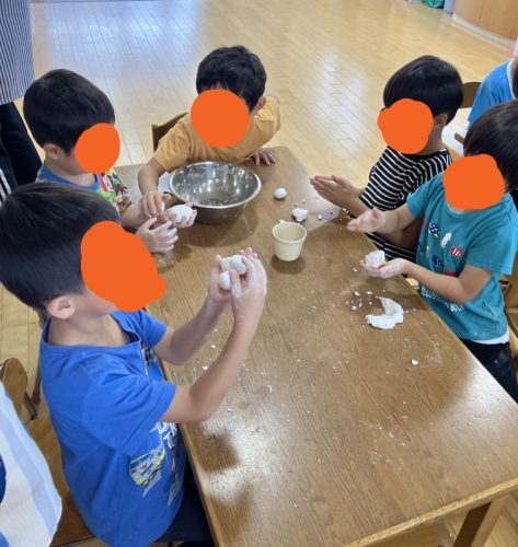 1グループ15個のお団子を作るので、1人3個づつ同じ大きさになるようにきれいに丸めていきます。お兄さんお姉さんがお手本となって、年下の子に教えてあげている様子がたくさん見られました。