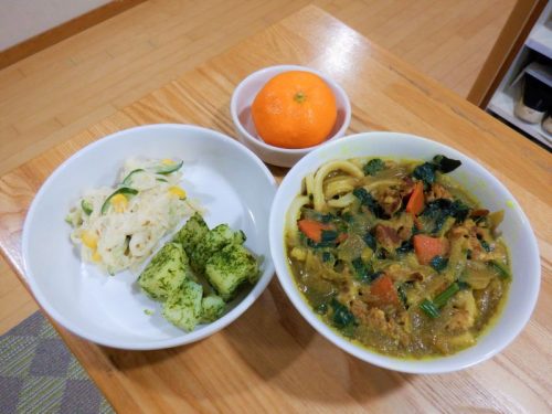『カレーうどん、粉ふき芋、 切干大根のごまマヨサラダ、みかん』